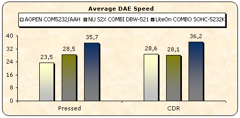 The LiteOn produced the fastest average ripping speeds of the comparison. The above graph shows that AOpen was the slowest device in the audio pressed ripping process.