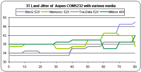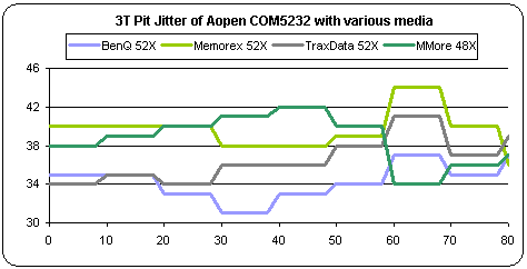 The Pit values for all four media measured, are on the high side. Only BenQ reported an average Pit value under the 35ns RedBook limit. In general, no media managed to stay within the 35ns limit.