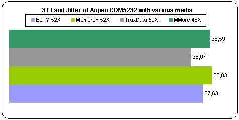 The AOpen is an all in one device. The drive is able to read DVD-ROM media and at the same time is a fast CD-R writer with a maximum supported writing speed of 52X. The writing tasks proved that the drive managed to write media at 52X but just as important is the quality of the writing. To check this, we measured the Pit and Land values of all written media and summarize the results on the following graphs. We need to mention however that of all the tested media, only four were written at the maximum speed of 52X