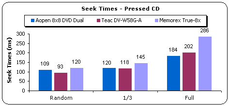 On the CD-R test disc, the Aopen drive gave back faster seek times than the other two drives for 1/3 and Full seek modes, at 120ms and 177ms respectively. On the Random seek Teac gave back the fastest access time.