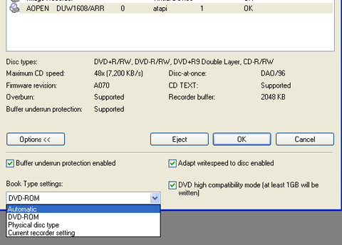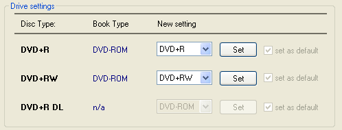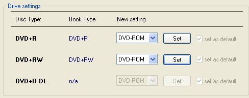 With the latest version of DVD Decrypter (3.5.2.0) we can check the current setting and alter the default booktype setting for DVD+R and DVD+RW discs. The default booktype setting in the burner's firmware for DVD+R/DVD+RW is DVD-ROM.