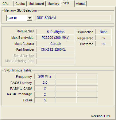 In this review, we will be comparing the Apacer Real500 Ram Modules with the Corsair XMS TwinX 1024-3200XL. Below you can see the SPD Timings for the Corsair XMS memory modules, according to CPU-Z.