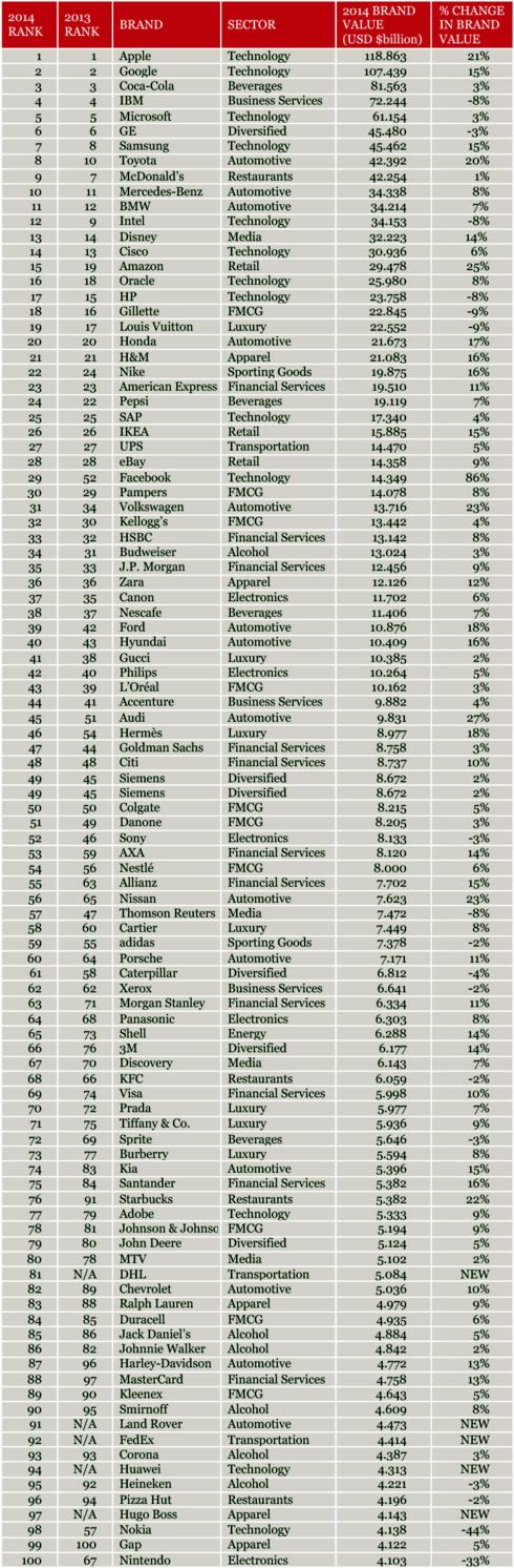 The biggest movers in the 2014 brand ranking were social network Facebook, up 86 percent to 29th place, car-maker Audi, up 27 percent to 45th place, and Internet retail giant Amazon, up 25 percent to 15th place.
