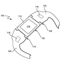 The device is labeled 'iTime' and lists capabilities for a central unit that syncs with an iPhone or Apple computer, relaying to the user data sent to the larger devices. It also mentions an electronic wristband and describe what could apparently form a standalone device: "the electronic device can be integrally formed with the electronic wristband which provides the additional circuitry or devices." In that case, communications such as calls could apparently be made entirely through the device.