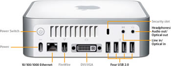OS X Tiger, iLife 06, Apple Remote, Front Row, Airport Extreme, Bluetooth, DVI Video Out (not Dual-Link), 4 x USB, 1 x FireWire, Gigabit Ethernet.