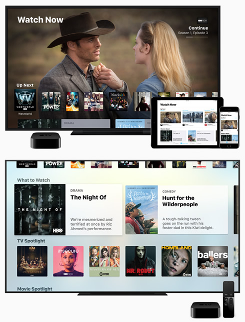- Watch Now: Watch Now is where viewers will see their collection of available shows and movies from iTunes and apps. From Watch Now, viewers can then go to Up Next or Recommended to choose what to watch.