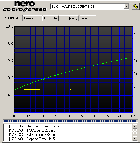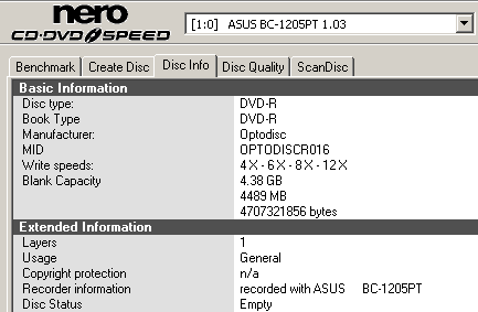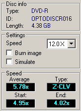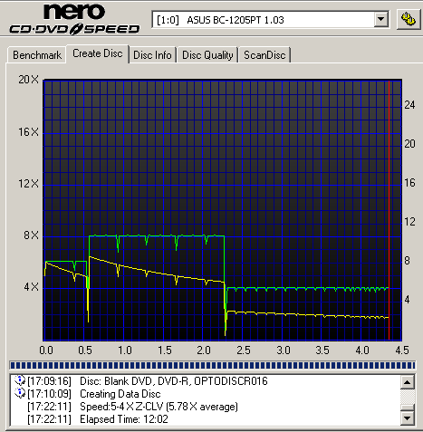 The writing speed did not reach its maximum with this Optodisc DVD-R media. At the half-way point, the speed drops from 8X to 4X instead of speeding up to 12X.