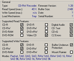 The drive was a December 2001 model with firmware revision v1.20 installed. We used the Nero (5.5.6.4), InCD (2.26), CloneCD (3.3.2.1) and Padus DJ (3.50.818) for the recording tests.