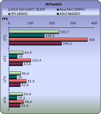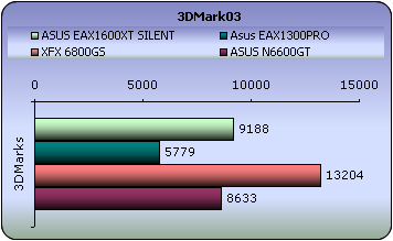 In the final 3DMark03 score, the EAX1600XT is just above the N6600GT with a respectable score, but a good deal behind the XFX 6800GS, which is way in front with the highest score.
