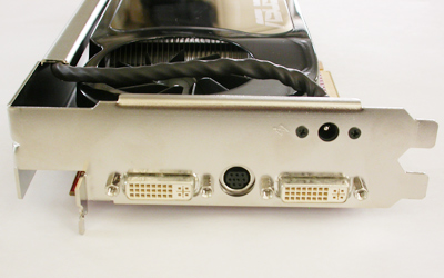 On the card's mounting bracket, you can see two DVI connectors, as well as the power connector, which is used with the optional AC adapter to power the card from an external source.