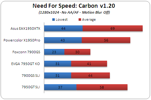 NFS Carbon is a no-go for Nvidia based cards. It would seem either the nVidia drivers need a good tune up. Both ATI based cards offered superb performance and the Asus EAX1950XTX leads the race with 69FPS.
