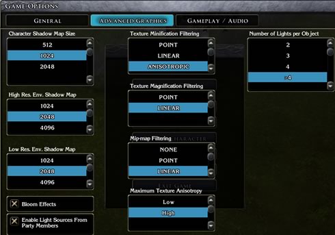 Anisotropic filtering was enabled in the "Advanced Graphics" tab, while Anti-aliasing modes were set by using Nvidia's 3D control panel.