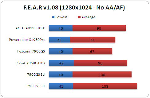 The Asus EAX1950XTX and eVGA 7950GT KO had very similar performance under F.E.A.R., without AA/AF enabled. Let's see how the cards perform with the various AA/AF modes: