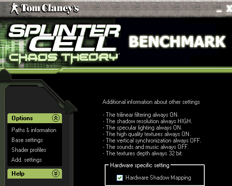 Splinter Cell Chaos Theory doesn't offer AA/AF modes, so we had to enable them from each card's 3D Control panel.