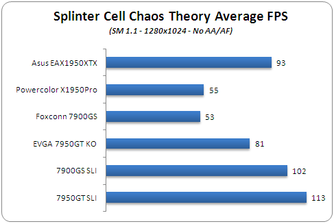 The Asus EAX1950XTX is still the fastest performing single card with 83FPS. That's 12FPS more than the eVGA 7950GT KO! The 7950GT SLI card still holds first place with 113 FPS. Splinter Cell - Chaos Theory also supports Shader Model 3.0 that can be enabled easily with the hocbench software: