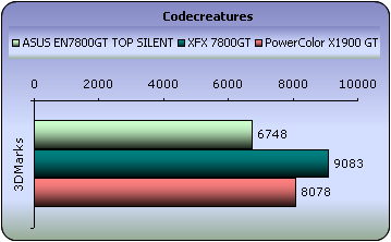 CodeCreatures is a synthetic 3D benchmark that is a good reference for VGA performance comparison. This is a high-end 3D benchmark that also requires DirectX 8 hardware, making a good tool for measuring the potential of DirectX 8 game performance.