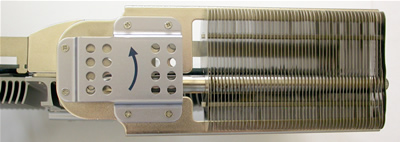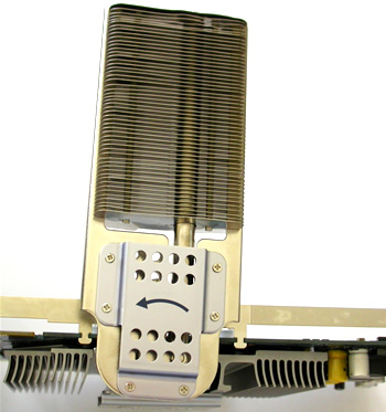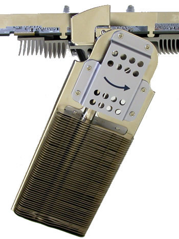 The fins can be rotated 90° up or down, and according to ASUS, if the combined height of the CPU and CPU fan is not be greater than 11cm, you rotate the fins so that they lie above the CPU fan, in which case the SilentCool uses the CPU's cooler to draw away any generated heat.