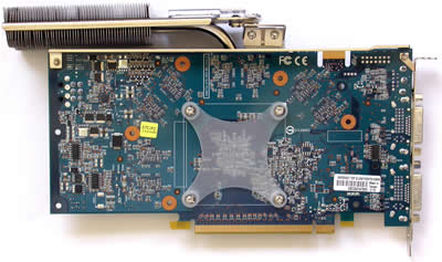 On the top there is a rather large heatsink that covers the GPU and the memory modules, with a heatpipe running from the GPU to an array of fins, which transfers the heat away from the GPU.
