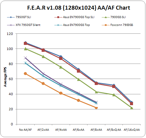 F.E.A.R is a demanding game and the Asus EN7900GS Top performed very well. It surpassed the "generic" 7900GS and was only 7FPS "slower" than the XFX7950GT Silent. Pairing two Asus EN7900GS Tops in SLI gives almost the same performance as a 7950GT SLI combination. It is interesting to see which card is less affected after enabling AA/AF: