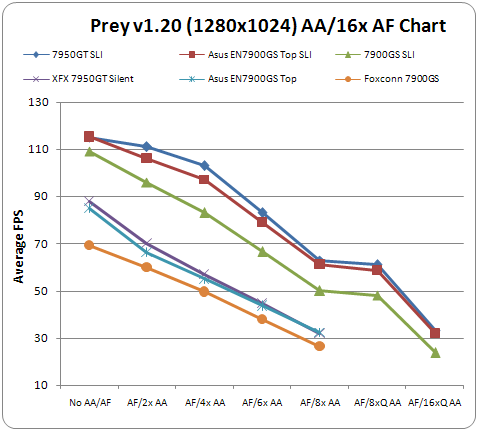 Without enabling AA/AF, the Asus EN7900GS Top was only 3 FPS slower than the XFX 7950GT Silent. The Asus EN7900GS SLI combination is somewhat slower than the 7950GT SLI but very close nonetheless.