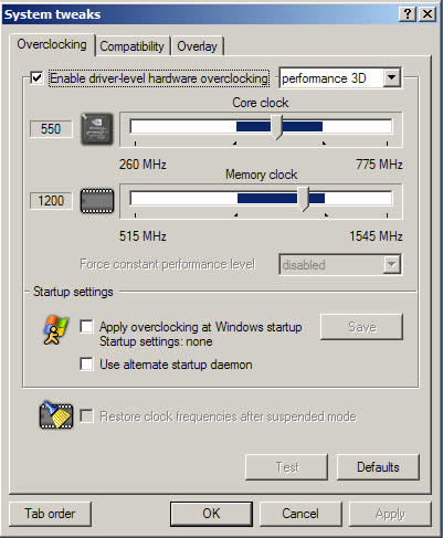 The default speeds for the Asus Extreme N6600GT are 515MHz for both the core and the memory clock. In order to overclock the card, we used Rivatuner V2.0 RC 15.3 New Year Edition.