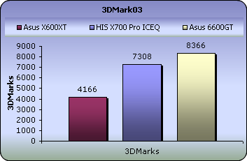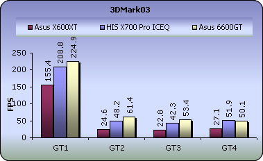In 3DMark03's GT1,GT2 and GT3 we see the Asus 6600GT producing excellent framerates compared to the HIS X700 pro. The difference between them varies from 9 to 26 fps. However, that difference is lost in the final Game Test where once again, an ATi card holds the top position.