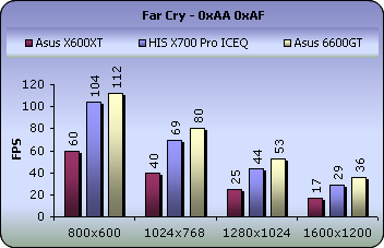 When running the benchmark with no anti-aliasing and trilinear anisotropic filtering, the Asus N6600GT outperforms the X700 pro from HIS by a significant number of frames per second.
