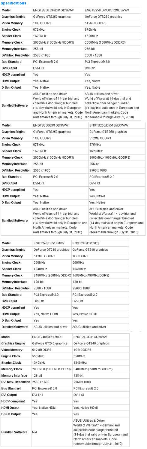 Five models -- the ENGTS250 DK/DI/1GD3/W, ENGTS250/DI/1GD3/WW, ENGTS250 DK/DI/512MD3/WW, ENGTS250/DI/512MD3/WW, and ENGT240/DI/1GD5/WW -- are bundled with a World of Warcraft 14-day trial offer and collectible door hanger, featuring artwork from the game.