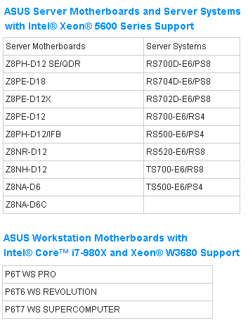 In related news, ASUS today announced that it is ready to support upcoming 32nm, 6-core processor platforms in its refreshed server and workstation lines. ASUS server motherboards and systems will support Intel Xeon 5600 processors, while its workstation motherboards will be ready for Intel Core i7 980X and Xeon W3680 processors.