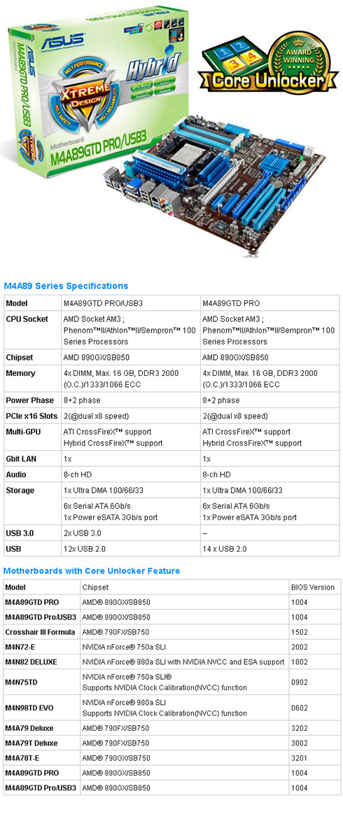 ASUS has garnered media distinction with its Core Unlocker technology, which unlocks latent cores on AMD CPUs installed on ASUS M4A89 Series and AMD 800 chipset-based motherboards.