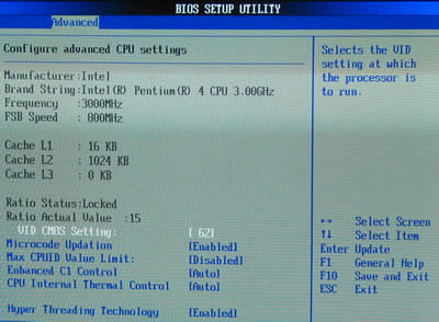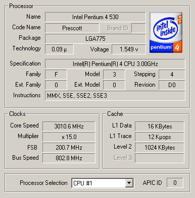 We used N.O.S to overclock our P4 3.0GHz processor. When idling, the processor settings are the following as detected by CPU-Z: