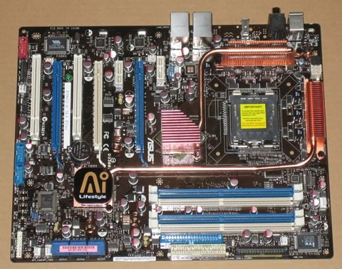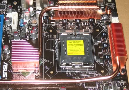 We can clearly see here the passive heat pipe cooling solution for the northbridge. As Asus comments "...The Heat Pipe design effectively directs the heat generated by the chipsets to the heatsink near the back IO ports, where it can be carried away by existing airflow from CPU fan or bundled optional fan...". The nearby components are low profile so there shouldn't be any problem with larger, 3rd party cooling solutions. However, the northbridge gets quite hot. Perhaps, Asus should have installed an active cooling solution to reduce overall heat, especially during overclocking.