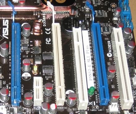 The Asus P5N32-E SLI Plus supports Nvidia SLI. There are 3x PCI-E x16 slots, two for SLI (blue) and one for physics card (white). Both blue PCI-E lanes are working at full 16x, while the white at 8x. There is plenty of space between the three PCI-E slots, so no problem there with extra large VGA cards: