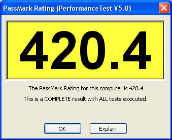 The "PassMark rating" is a weighted average of all the other test results and gives a single overall indication of the computers performance. The bigger the number, the faster the computer. The "PassMark rating" can only be calculated if the results from all other tests are available. The value is calculated as follows.
