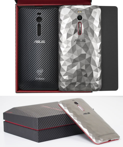 ASUS today introduced the ASUS ZenFone 2 Deluxe Special Edition, powered by a 64-bit 2.3GHz Intel Atom Z3580 processor and the Intel XMM 7260 LTE Advanced modem. Part of the ZenFone 2 family, the new ZenFone 2 Deluxe Special edition offers an extra 64GB of onboard storage (for a total of 128GB), 4GB of RAM and two new back covers. One has a carbon-fiber styling and the other is a faceted style, like the Deluxes, but instead comes in a smooth metallic silver.