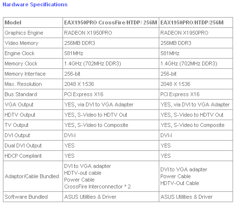 The new EAX1950PRO series supports ATI's CrossFire Technology, which allows multiple GPUs to operate simultaneously for enhanced video performance. Superior graphics quality is achievable with the EAX1950PRO CrossFire/HTDP/256M and EAX1950PRO/HTDP/256M installed in the same system in CrossFire mode.