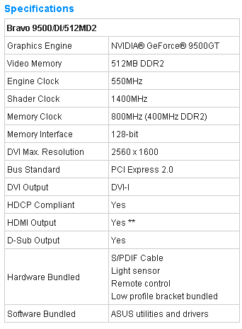 The Bravo 9500 is also energy efficient thanks to its improved power design. In 2D mode, the Bravo 9500's power efficiency is 92%, a 28% improvement over that of generic GeForce 9500GT cards. This results in less heat generated, and a significantly reduced probability of abnormal heat-induced events occurring.