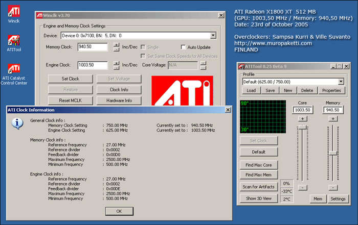 A team of Finnish over-clockers claim that they have managed to over-clock the Radeon X1800 XT graphics processor from ATI to engine clock levels above 1 GHz. Noted Finnish over-clockers Sampsa Kurri and Ville Suvanto achieved graphics engine clocks of 1.003 GHz and a memory speed of 1.881 GHz (940.50 MHz DDR memory clocks), while maintaining the system stability and no visual artifacts.