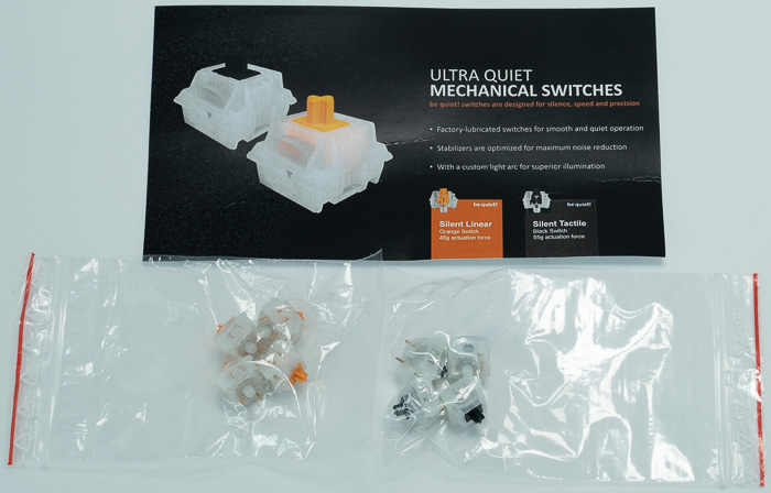 Looking at the keyboard, you will find a typical ANSI layout, all keycaps are black, while all letters have transparent material to glow in the dark making it easy to use. be quiet! offers 4 key layouts: US-International (ANSI), UK-English (ISO), FR-French (ISO), and DE-German (ISO). The Dark Mount includes a magnetical mount of the included numpad, which we first saw with the Everest Max mechanical keyboard. There are three LEDs next to the arrow keys for num lock, caps lock, and scroll lock.
