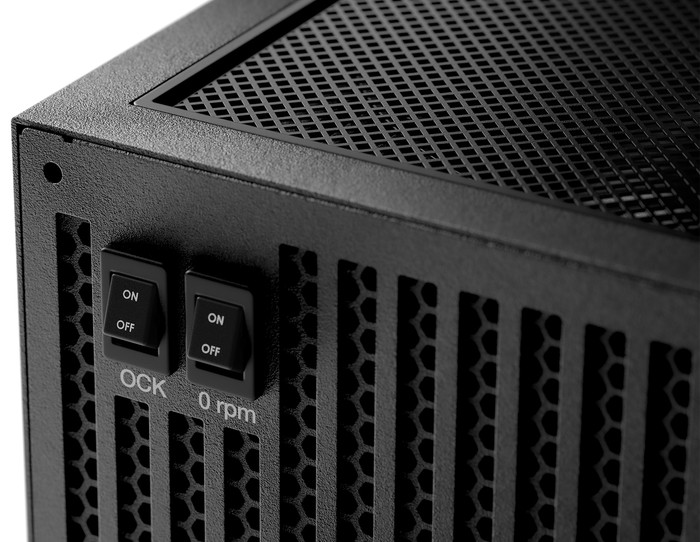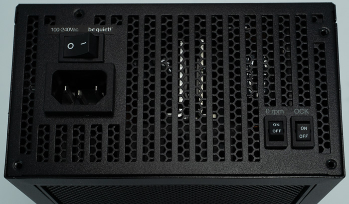 The back of the PSU includes a honeycomb design to help transfer the produced internal heat from the PSU. You will also find the power/on-off switch and 0rpm on/off switch, and of course, the OCK (overcloaking) switch to make the power supply work between the default four 12V-rail mode and the alternative massive single-rail operation.