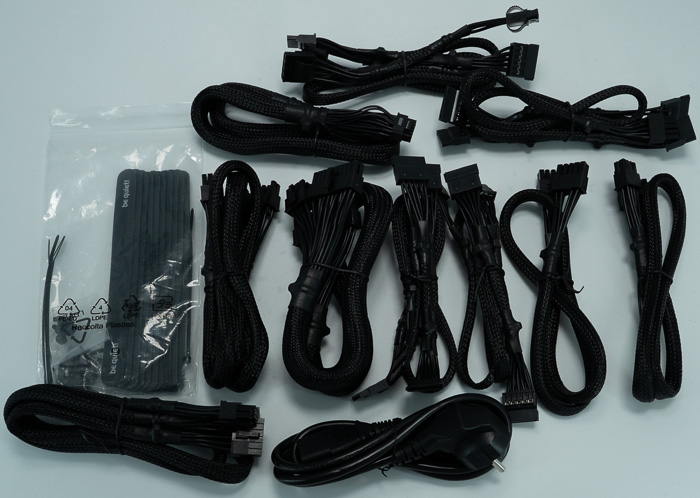 The PSU is designed with modular cables in mind and has two types: a sleeved cable (20+4pin) and the rest are flat. The maximum cable length is 105cm (SATA+PATA cables), while the 20+4 motherboard cable is 60cm, which should be enough even for big-sized cases. We would like to have a slightly longer distance between SATA and PATA cables of 200mm. Included, you will find 10 high-quality cables