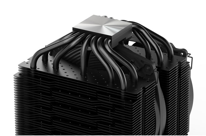 The base of the CPU cooler is covered via a protecting sticker unveil a perfectly bottom for the CPU to come in contact. The base is CNC machined and it has Copper, while there are seven heat pipes with 6mm diameter for passing heat from base to the core of the CPU cooler.