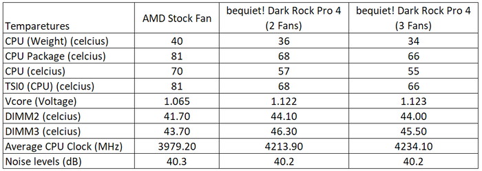 As was expected the be quiet! Dark Rock Pro 4, gave very good performance gains VS the AMD stock fan. After running the AIDA64 stability software for over three (3) hours we got several reported numbers either for temperatures, noise and CPU frequency.