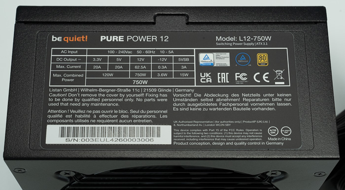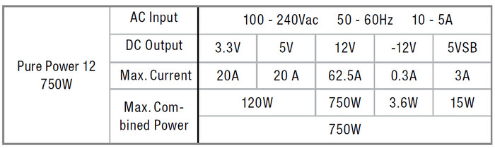 At the back, we can find the power ratings of the product. The power supply has one (strong) +12V rail producing 62.5A and. The +5V boosts 20A, while the +3.3V rail 20A. Lastly, the +5VSB gives another 3A. While the product has a single +12V rail, it should hold just fine with general use.
