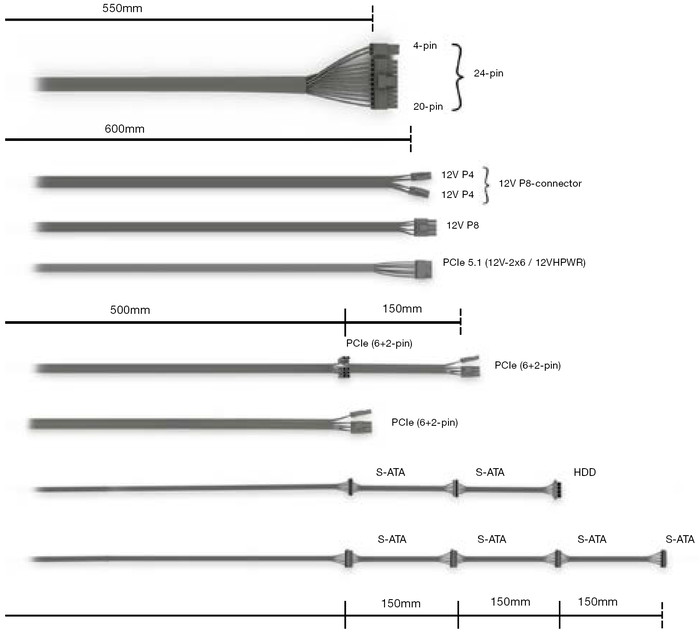 There are both sleeved and flat cables included with a max cable length of 55cm, while the main ATX24V cable is 60cm long.