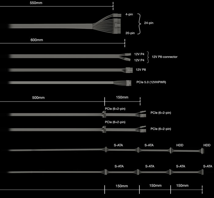 The PSU is designed with modular cables in mind and has two types a sleeved cable (20+4pin) and the rest are flat cable. The maximum cable length is 95cm (SATA+PATA cables), while the 20+4 motherboard cable is 55cm, which should be enough even for big-sized cases. Below is a chart with all included cables and their corresponding lengths. We would like to have a slightly longer distance between SATA and PATA cables of 200mm.