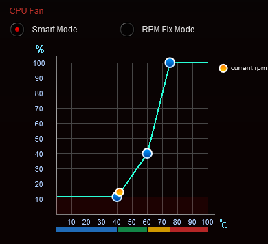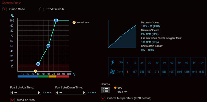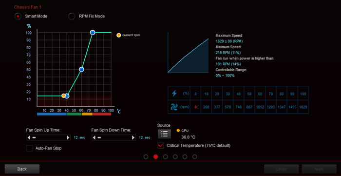 While for the case fans we set also SmartFan mode with the option for Auto Fan Stop at low loads down to 0% for the two front fans and auto for the back case fan.