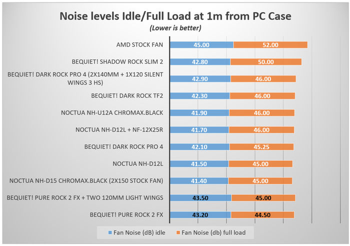 Placing the miniDSP UMIK-1 microphone around 1m from the closed case, we got good noise levels, in any case we didn't exceeded 45db (including the three fans from the case). At the idle we did noticed that the Light Wings are almost close to the fan used at the Shadow Rock Slim 2, but since our chamber is not 100% isolated, take this result with a grain of salt. In normal use the be quiet! Pure Rock 2 FX would be very silent even at full load.