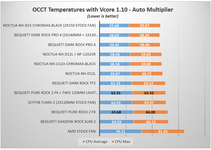 Since we had in our labs a second be quiet! Light Wings ARGB fan, we made two test runs, either with one fan or two to see if users can expect improvement at performance or not. The be quiet! Pure Rock 2 FX we can say performed as expected due to its size slight better than the be quiet! Shadow Rock Slim 2 and with the two fan setup, close to the be quiet! Dark Rock TF2. Adding a second 120mm Light Wings fan, didnt improved much average temperatures, but improved max temperatures by three (3) Celsius from our testing.
