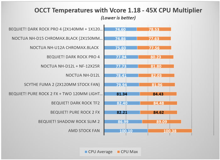 Lastly, we wanted to see how this CPU cooler will handle even higher temperature loads, so we set CPU multiplier to 45X and set CPU Vcore at 1.18V.